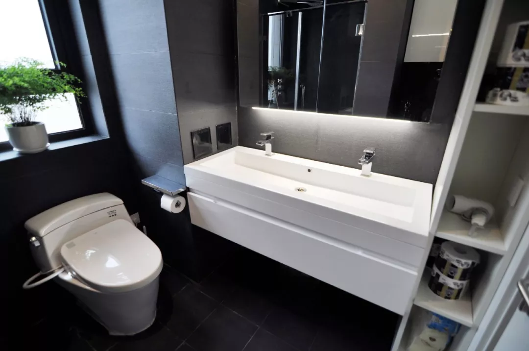 壁龛、隔板等都是卫生间收纳的好帮手,特别是卫生间经常会有一些凹凸平面,比如包水管的墙面会凸出,比如壁挂马桶背后水箱会有平台等等,这些凹凸平面不要浪费,正是设计壁龛或者隔板的好地方。