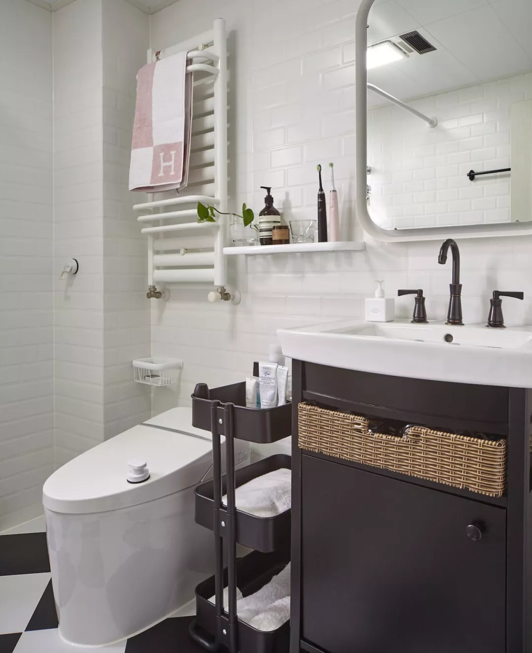 马桶背后和两侧也是有一些小空间可以利用的,如题图这样,往往这个位置会被浪费,放上一个长脚的架子,可以解决不少收纳问题。